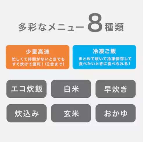 また、8種類のメニュー切り替えがあります。(白米・無洗米・早炊き・少量高速・おかゆ・炊込み・ケーキ・クリーン)